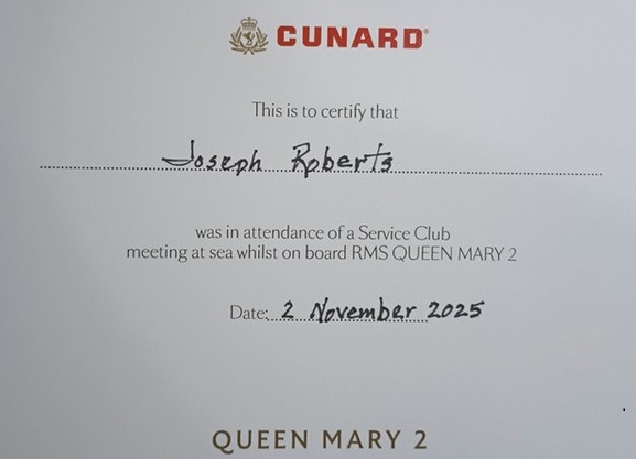 Rotary At Sea![]() Joe Roberts had the unique opportunity to attend a Service Club meeting while on the Queen Mary 2. This serves as a make up meeting attendance credit for any Service Club. |